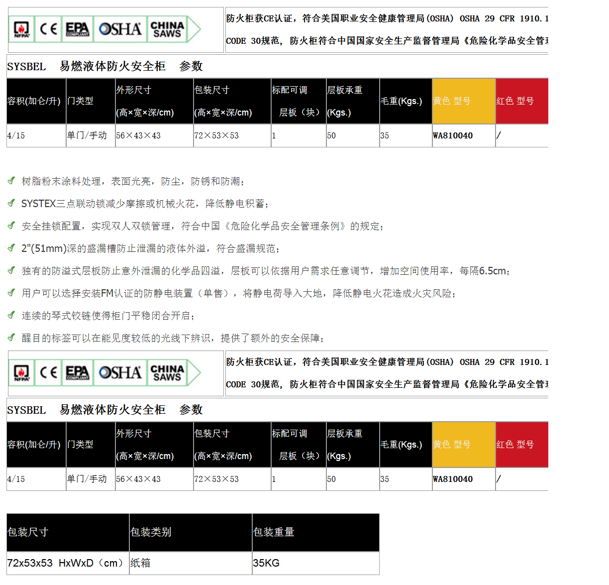SYSBEL高品质易燃液体安全柜由双层18 Ga(1-mm)钢板通过点焊接构造,两层之间相隔38mm的形成良好的防火绝缘层;