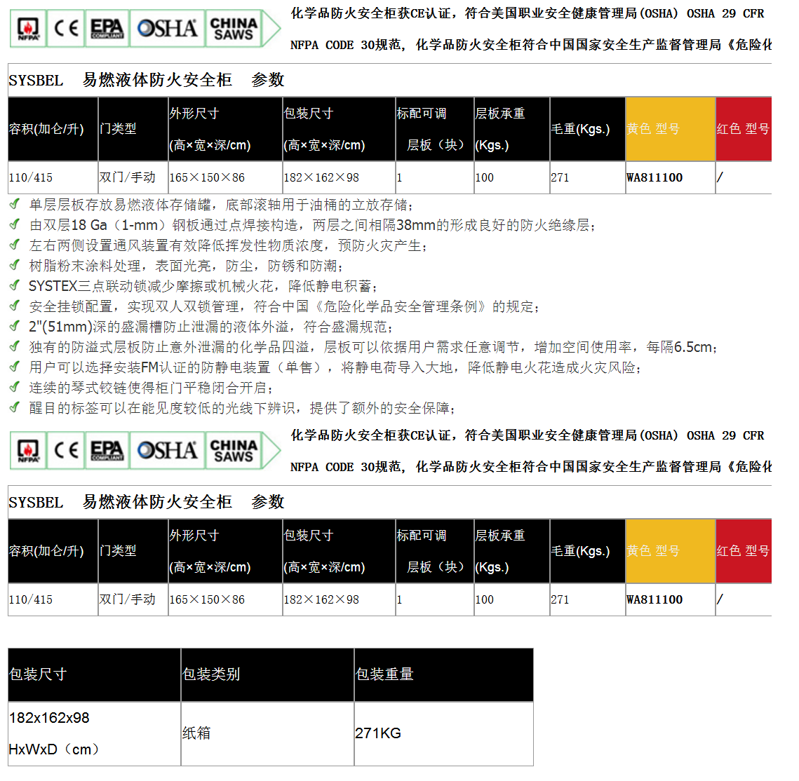 SYSBEL高品质易燃液体安全存储柜广泛应用于存储易燃液体(低,中闪点液体,液体闪点<37.8℃),降低火灾风险,保障生命财产安全。